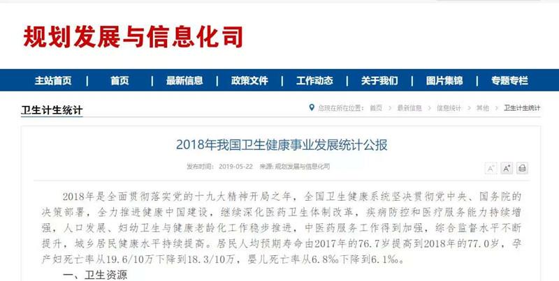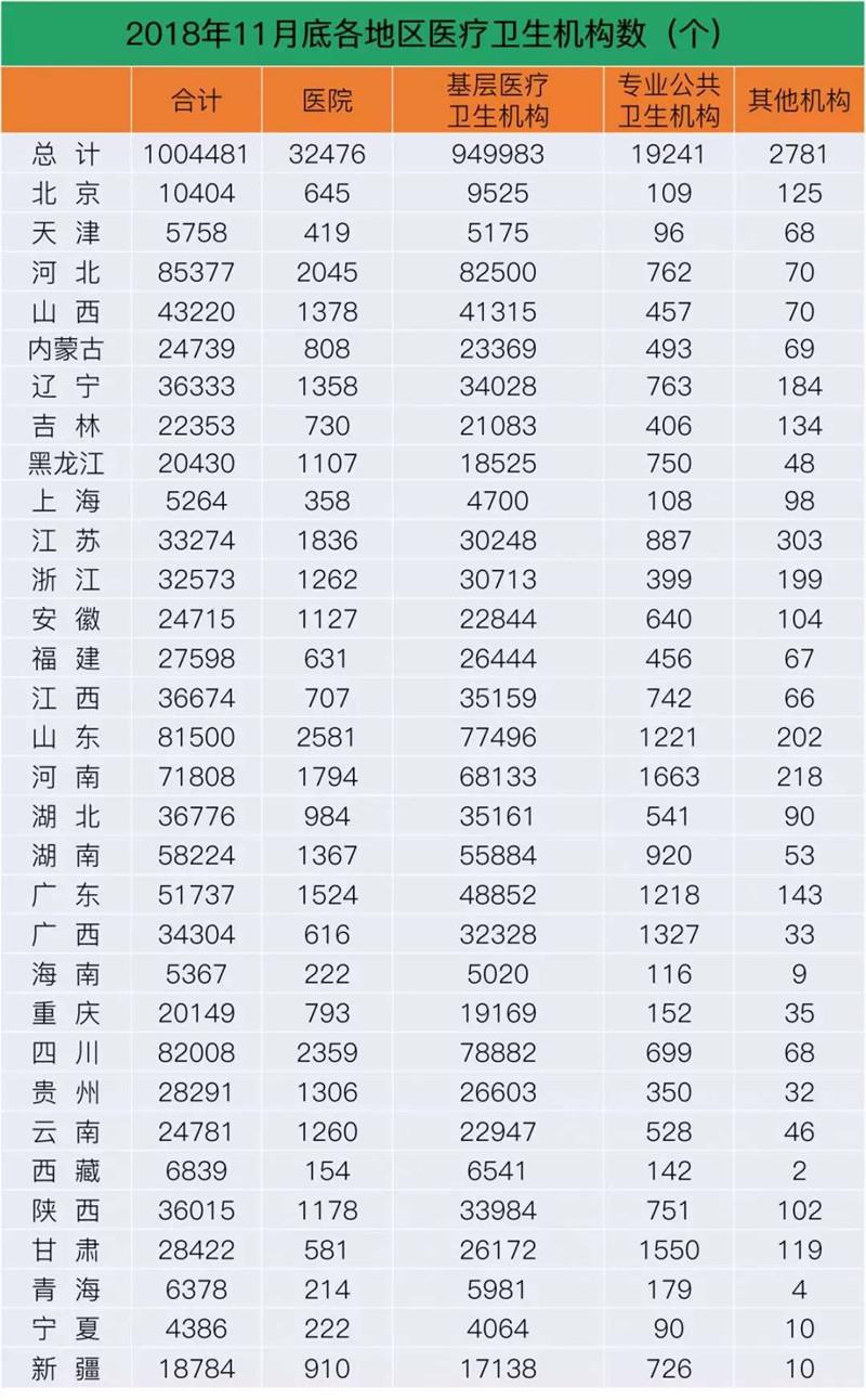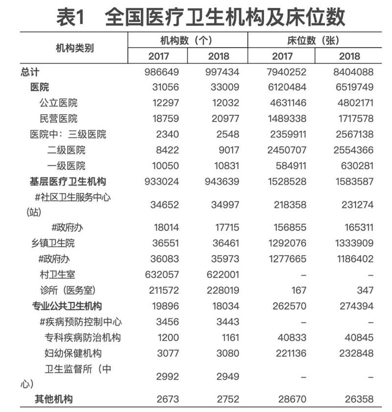 5月22日,國家衛生健康委發布《2018年我國衛生健康事業發展統計公報》(下稱《公報》)。數據顯示,2018年末,全國醫療衛生機構總數達997434個,其中醫院33009個。