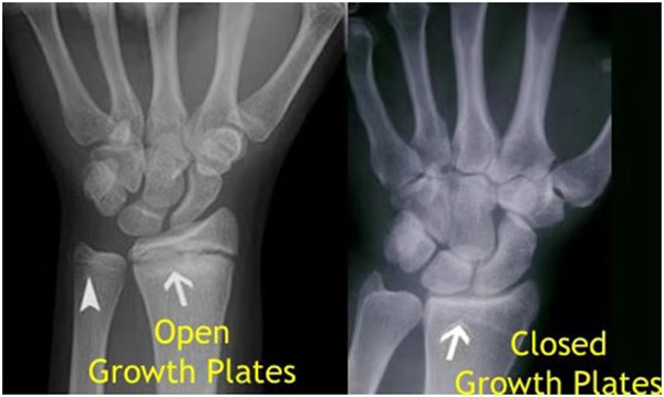 我們都知道,人體的高矮是由骨骼的生長發育決定的,特別是下肢長骨。長骨呈長管狀,在長骨的兩端有一種專管骨骼生長的骺軟骨,它與干骺端之間有一盤狀軟骨結構稱為骺板(線),在幼兒的X光片上表現為一條較寬的透光帶。 (見下圖)