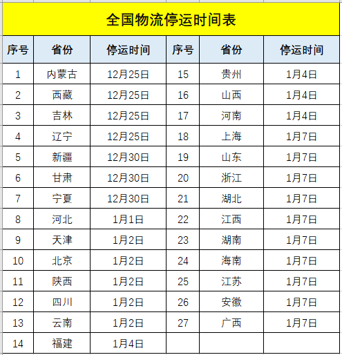 由于天氣寒冷以及霧霾天氣嚴(yán)重,今年全國(guó)物流停運(yùn)時(shí)間比往年來(lái)得早。基于國(guó)家交通部、物流部等部門發(fā)出的通知,距離物流停運(yùn)時(shí)間不多了,部分區(qū)域物流將于1月5日開(kāi)始陸續(xù)放假停運(yùn),1月18日將全國(guó)大范圍停運(yùn)。