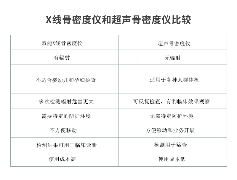 ■ 目前用于臨床的骨密度測量儀器有兩大類,即雙能X線和超聲骨密度測試,雙能X線骨密度儀是行業檢測標準,準確度高,但從安全性方面超聲骨密度儀有明顯優勢,這對人們日益敏感的輻射保護非常重要,比較如下。
